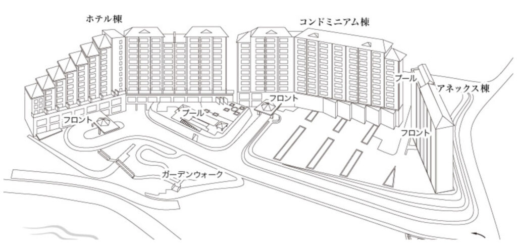・ホテル棟:レストラン2ヶ所(全3ヶ所中)、ショップ、プール、スパなど設備が充実・